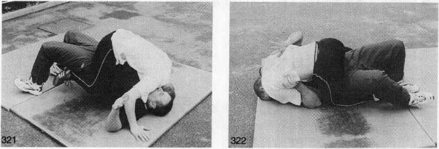 按上述的方法将陪练者摔倒在地并骑在他身上让你的陪练者尽量试图将你翻过来压在身下而你则采用一切办法来努力保持这种姿势(图321、图322)。
