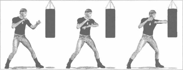 目视沙包身体重心落在两腿上(图2-3-4)出肘时右脚先快速用力蹬地脚跟稍提起后腿膝关节略伸直将身体重心向前过渡到前脚上上体略向右转含胸、扣肩、拱背左臂屈肘、内旋回收至胸前手心向下(图2-3-5)随即在后脚蹬地时,左脚顺势向前踏出用前脚掌的内缘着地同时左臂迅速夹紧肘部以肘尖为力点快速沿直线向前击打沙包拧腰展胸开肩发力同时配合呼气。在左肘击中沙包的一瞬间左手突然握拳右手随左肘的出击而自然摆动保护下颌和面部(图2-3-6)前手顶肘完成击打沙包动作之后左臂迅速放松由原路收回同时前脚的脚掌做短促有力的蹬地推动身体后移随即后脚向后滑动一步用前脚掌着地着地后前脚迅速沿地面拉回拉回的距离应与后脚滑动的距离相同身体重心随两脚的移动平稳地后移恢复呈左前式基本格斗姿势(图2-3-7)紧接着再进行后手顶肘的击打出肘时上体快速有力地向左前方扭转同时拧腰转胯右臂屈肘内旋至于胸前手心向下含胸、扣肩、拱背(图2-3-8)随即右脚用力蹬地身体略前倾重心前移右臂迅速夹紧肘部,以肘尖为力点快速沿直线向前击打沙包拧腰展胸开肩发力同时配合呼气。在右肘击中沙包的一瞬间右手突然握拳左手随右肘的出击而回收使左手置于下颌附近保护下颌和面部(图2-3-9)击打动作结束后迅速还原呈左前式基本格斗姿势。