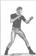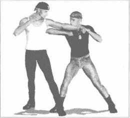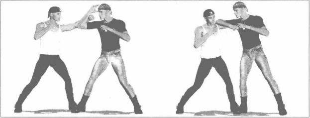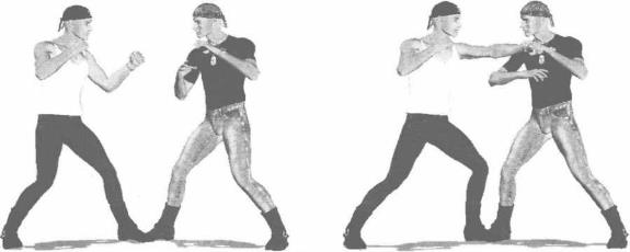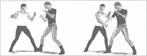 3 在街头双方发生冲突严阵以待(图2-3-16)对方率先发动攻击进身以左直拳击打我胸部我迅速闪身避让其拳峰并顺势用左手刁抓住其左手腕部同时右臂屈肘护于胸前(图2-3-17)随即右臂屈肘夹紧,