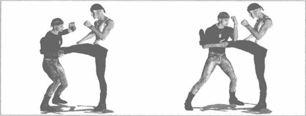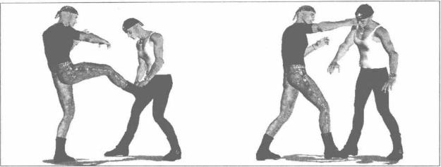 4双方在街头展开打斗对方趁我不备突然抬起右脚蹬踹我腹部(图2-3-81)我迅速向左闪身躲避其右脚的凌厉攻势同时用右臂自下而上抄拦对方右腿脚踝部位(图2-3-82)随即左脚向前上步左臂屈肘以肘尖为力点向下砸击对方右腿(图2-3-83)