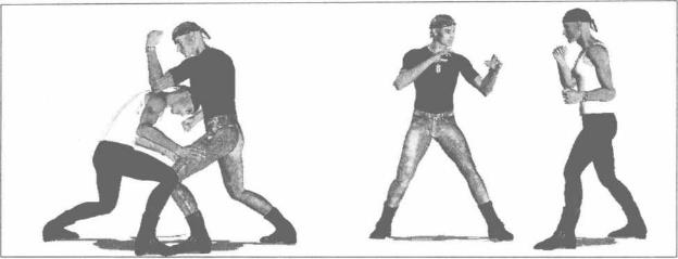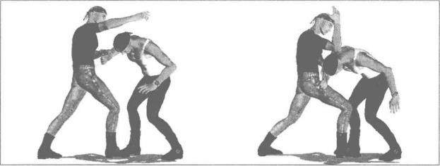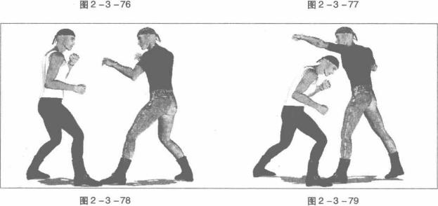 78)我突然以左直拳袭击对方头部对方俯身、藏头及时躲过使我直拳攻击落空(图2-3-79)在对方俯身刹那间我左臂迅速屈肘以肘尖为力点向下砸击对方后颈部或者肩胛部位(图2-3-80)。