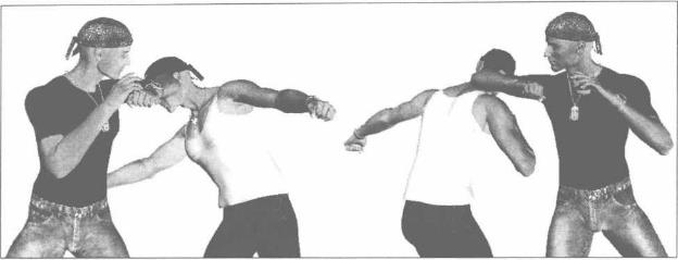 扫肘除以平行路线发肘外还可以从斜上、斜下等各个角度出击变化多端主要用来攻击对手头部太阳穴(图2-3-84)、脸颊、脖颈(图2-3-85)、胸口、腋下、软肋等部位。