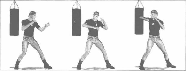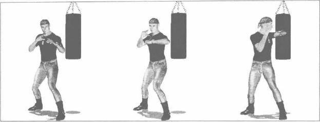 在身体后方近距离悬挂沙包然后按左前式基本格斗姿势站立全身放松目视前方身体重心落在两腿上(图2-3-86)出肘时身体先略向右侧转动同时左臂内旋、屈肘、夹紧肘尖略上抬横于左胸前令手心向下蓄势待发(图2-3-87)随即身体再猛然向左转动拧腰转胯同时借助肩、腰转动的力量带动左臂肘向左后方横扫出击以肘尖后侧为力点击打沙包高与肩齐手心向下左肩随臂肘的摆动而向后伸展目视左肘尖在左肘击出的一瞬间左手突然握紧拳头以助发力同时配合呼气右手随左肘的出击而自然摆动保护下颌和面部(图2-3-88)击打动作结束后左臂迅速放松由原路收回身体一并右转迅速恢复呈左前式基本格斗姿势(图2-3-89)紧接着再进行后手扫肘的击打出肘时身体微向左侧转动右臂屈肘、内旋横于右胸前令手心向下同时左臂屈肘收护于头部左侧蓄势待发(图2-3-90)紧接着身体猛然向右转动拧腰转胯同时借助肩、腰转动的力量带动右臂肘向右后方横扫出击以肘尖后侧为力点击打沙包高与肩齐手心向下右肩随臂肘的摆动而向后伸展目视右肘尖在右肘击出的一瞬间右手突然握紧拳头以助发力同时配合呼气左手随右肘的出击而自然摆动保护下颌和面部(图2-3-91)击打动作结束后身体迅速放松右臂迅速由原路收回身体一并左转迅速恢复呈左前式基本格斗姿势。