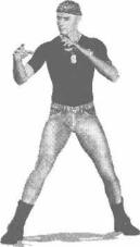 根据人的生理特点与格斗经验防御姿势原则上都是将有力的手和脚放在后面(李小龙的截拳道是个例外)目的是能够更加有力地击打对方。本书中示范的姿势基本以左前式为主即左脚与左拳在前这种站姿最为普遍常见当然也有部分左撇子使用右前式站姿(图除方向左右相反外其动作要求与技术要领并无其它差异。