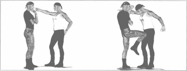 1街头发生争执时对方用右手指点我面部(图2-5-9)我可以迅速用左臂向外磕开对方右臂右腿猛然屈膝提起以膝盖为力点向前顶撞对方裆腹部予以重创(图2—5—10)