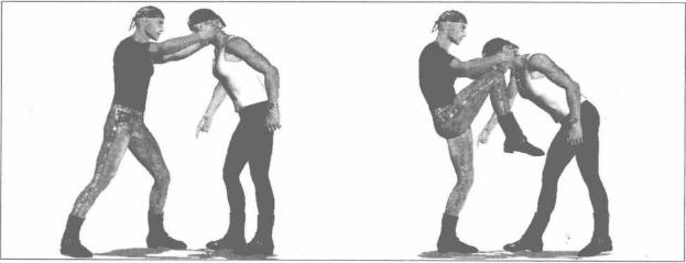 在街头双方互相撕扯展开肉搏(图2-5-17)对手实力较强防守严密一时无法由正面发起有效进攻我可以突然身体向左拧转抬起右腿屈膝横向顶撞对手侧肋(图2-5-18)。