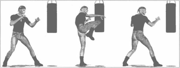 在身体左侧前方较近距离悬挂一个沙包首先按左前式格斗防御姿势站立全身放松目视沙包身体重心落在两腿上(图2-5-13)攻击时左脚跟突然内扣左腿挺膝直立身体猛然向左转动面对沙包重心向前移动右腿随之屈膝抬起右脚向外横摆随身体转动向左前方沿弧形路线横顶撞出以膝盖为力点撞击沙包侧面高与胯齐,目视前方出腿瞬间呼气(图2-5-14)右膝攻击结束后调整步法向后撤身双腿屈膝使身体右成前式格斗防御姿势站立(图2-5-15)紧接着再进行左膝盖的侧向攻击出腿时右脚跟突然内扣右腿挺膝直立身体猛然向右转动面对沙包重心向前移动左腿随之屈膝抬起左脚向外横摆随身体转动向右前方沿弧形路线横顶撞出以膝盖为力点撞击沙包侧面高与胯齐目视前方出腿瞬间呼气(图2-5-16)攻击动作结束后左腿肌肉与各关节迅速放松左脚自然落地调整步法向后撤身双腿屈膝还原呈左前式格斗防御姿势站立。