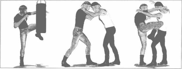 以上动作可以反复进行左右膝连续撞击沙包两侧。