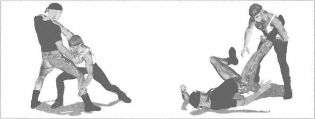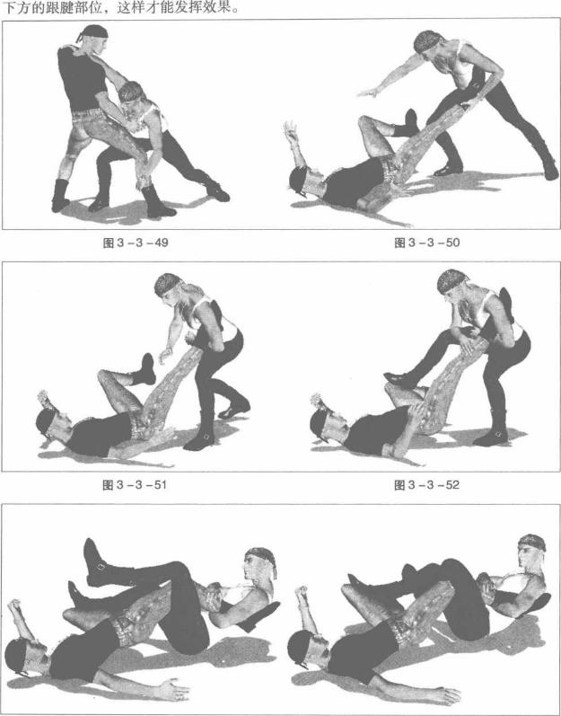 动作说明双方交手相互撕扯我左手抓住对方右臂右手搂抓对方左侧肩颈(图3-3-48)看准时机我猛然俯身用左手抄搂对方右腿小腿部位(图3-3-49)右手用力向前推操对方左肩左臂屈肘向上提拉对方右腿实盘将其掀翻在地(图3-3-50)对方倒地瞬间我左脚迅速向前上步左臂顺势屈肘圈揽住对方右脚脚踝并用力将其揽至左侧腋下(图3-3-51)随即身体重心下沉同时右腿屈膝抬起以右脚踩踏对方左腿大腿及膝窝部位右手扶按住其右腿胫骨部位(图3-3-52)动作不停以臀部着地上体后仰(图3-3-53)随即左腿屈膝抬起绕过对方右腿以左脚脚踝勾住自己右腿膝窝部位双腿缠绕住对方右腿(图3-3-54)继而左臂揽紧对方右脚脚踝以小臂楮骨为力点切锁对手脚踝下方的跟腱部位左肘猛然向下掖