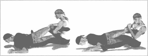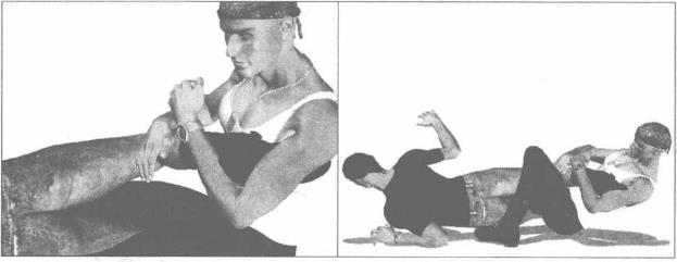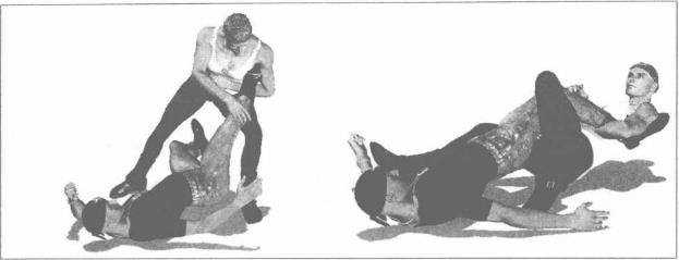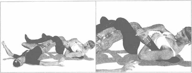 肘挺胸抬头左肩向左外侧翻转针对其脚踝实施锁控(图3-3-55、特写图3-3-56)。