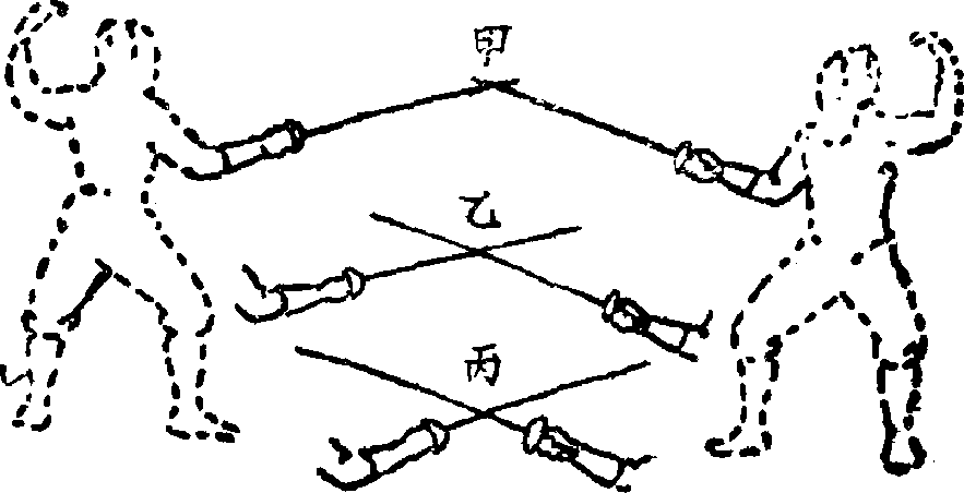 距离距离甲、远距离甲、远距离——是前进一步成箭步就可以刺中的距离。乙、中距离——-只做箭步就可以刺中的距离。丙、近距离——只是伸直手臂就可以刺中的经离(图9)°——是前进一步成箭步就可以刺中的距离。乙、中距离——-只做箭步就可以刺中的距离。丙、近距离——只是伸直手臂就可以刺中的经离(图9)°图8图8图9图9