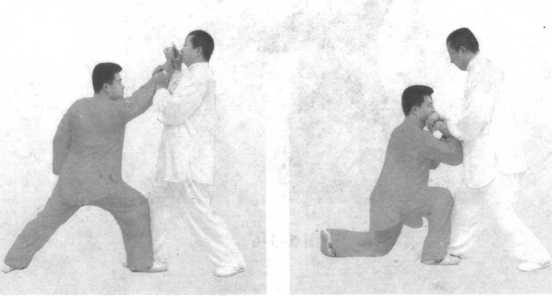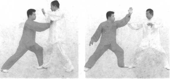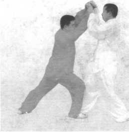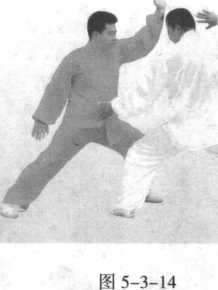 图 5-3-9图 5-3-9甲冲步挺腰,右拳反腕豁打乙下腭;乙则身后仰,右掌贴身 从下腭探出与左掌相合,锁住甲拳往下猛扣。(图5-3-9、图 5-3-10)