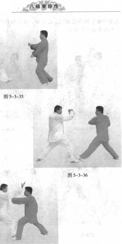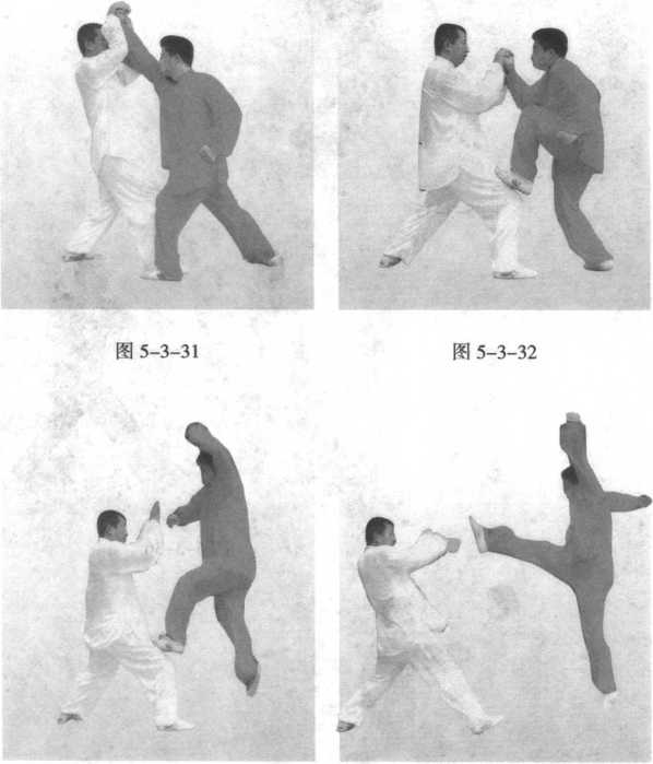 甲挺腰带肘破反掌,紧跟着蹬乙右大腿部,借劲腾空跃起,在空中弹右腿踢乙面门;乙后仰,双掌斜拍甲弹腿。(图 5-3-31 至图 5-3-37)