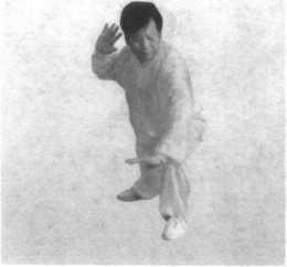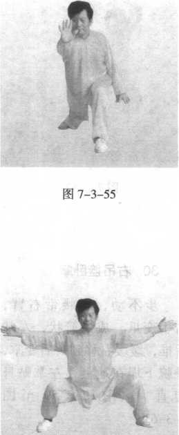 左手搂右膝,上左步,右掌推出,左掌下塌,至左腿旁。 (图 7-3-54、图 7-3-55)