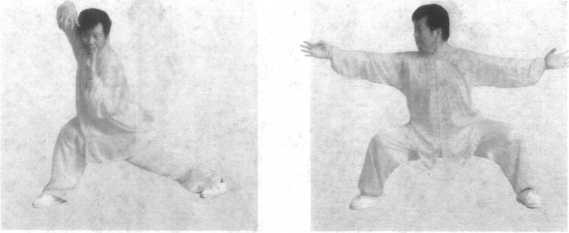 右手变爪成吊篮状,左掌后推,身右移,上左步,两臂自胸 前交叉后向两侧下劈,成马步。(图7-3-57、图7-3-58)