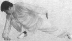 步不动,撤腰带右臂, 右手变爪,成吊篮状,左掌 后推,缓缓右移到头后变掌, 卧腕下塌在地上,左掌贴身 伸直。(图7-3-59至图 7-3-61 )