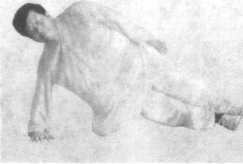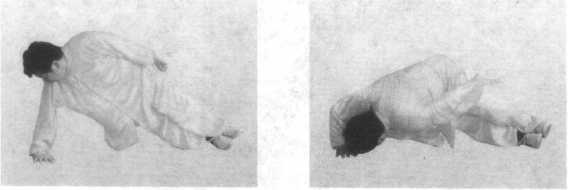右脚回撤,两腿并拢,身体斜躺,右臂支撑,然后身体下 扑,嘴找掌背,再往上翻。(图7-3-62至图7-3-64)