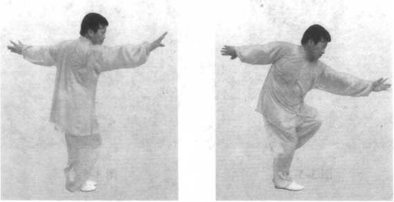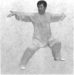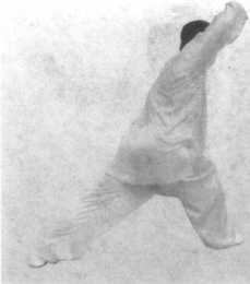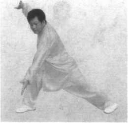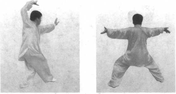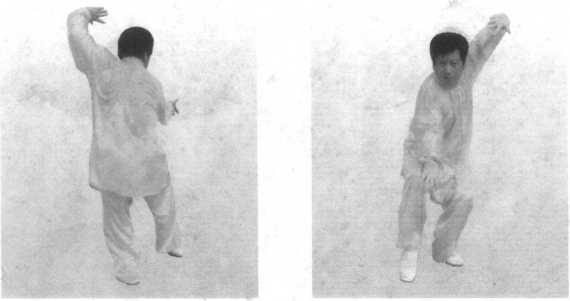 左跨步,右步跟成虚步,左手反捋,右手托肘;然后右跨 步,右手反捋,左手撩阴。(图3-5-43、图3-5-44)