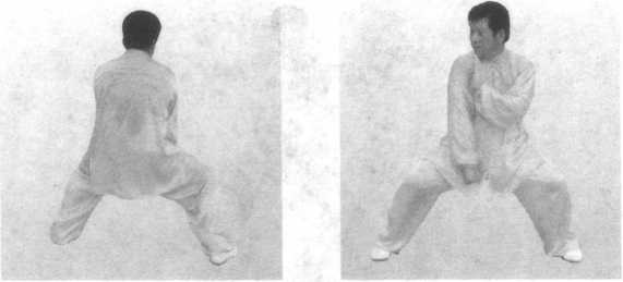 左手掸腿,拧身撤左步,右掌从右耳根往下揣至裆中,左掌 在右肩胛处,成马步。(图3-5-38至图3-5-40)