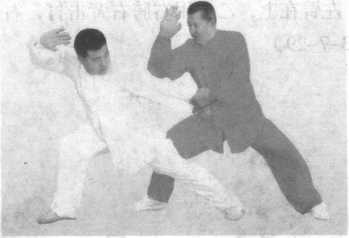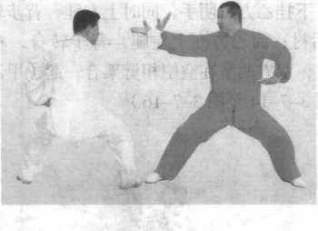 甲方震右脚上左步,右手反手摞,左臂成立肘坐腰压乙方右 臂;而乙方坐腰撤右步,同时左手猛推甲方左肩成落步掌。紧跟 着,甲方震左脚上右步,左手反手摞右臂成立肘,坐腰压乙方左 臂,而乙方坐腰撤左步,同时,右掌猛推甲方右肩成落步掌。 (图 3-7-17 至图 3-7-20)