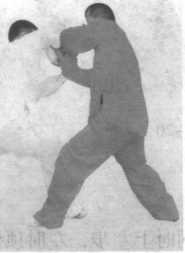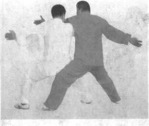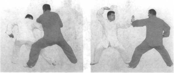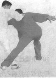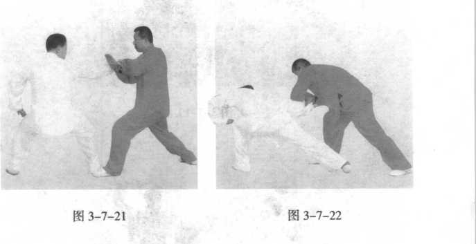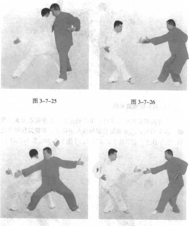 往后蹬挂甲方左腿,甲方为防止被挂爬下,左腿往里插,然后甲 乙同时撤身成虚步,猛烈相撞(肩背相合腰胯相击),甲方用左 胯左背击打,左臂在上,乙方用右跨右背击打,右臂在下。(图 3-7-21 至图 3-7-29 )
