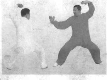 甲方双手反缠乙方右手腕,同时上左步,左肘顶住乙方右肘 往下压,乙方则左手扣住甲方左手,同时右肘往上猛提,滚肘反 缠甲方双臂,然后猛抽出右手,向下推压甲方左肩部,右脚贴地