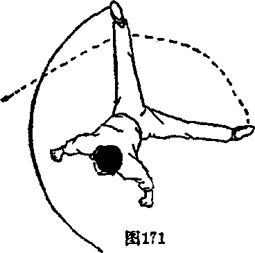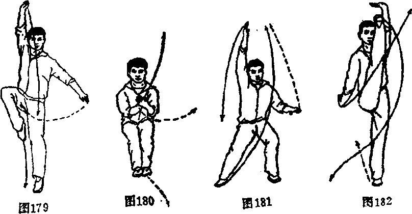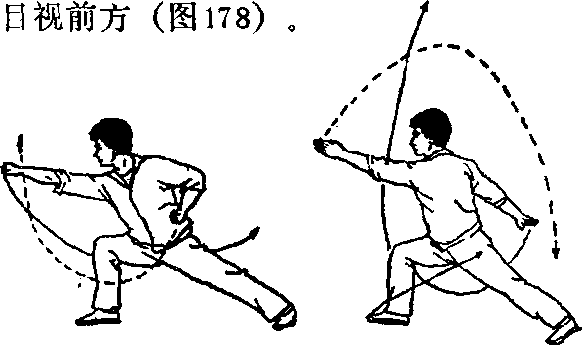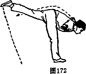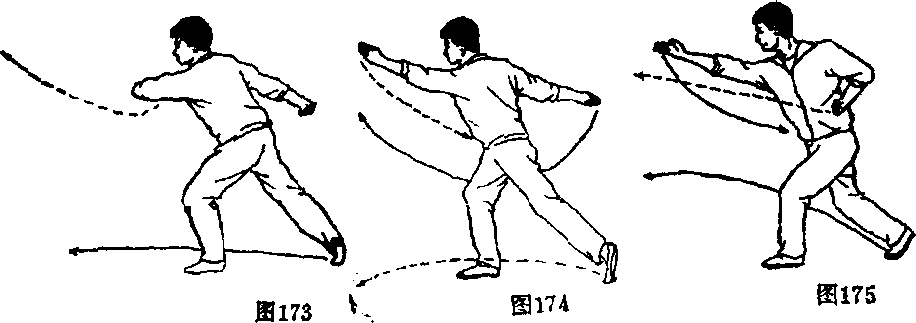(1)左腿向后落步,随后身体左转,右腿蹬直,重心左 移;左臂屈肘平摆体前,右臂举于右斜下方;目视前方(图 173)。