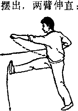 (1)上体右转,左臂向下、向前抡摆,右臂向右、向后