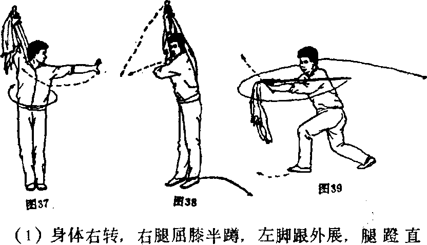 (1)身体右转,右腿屈膝前弓,左腿伸直成弓步;右 手持刀随转体向前、向右平摆,臂伸直,左手下落屈肘收至