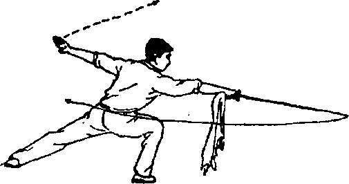成弓步;右手持刀随转体向前、向右平摆,左手举于体左 侧,两臂伸直,手心向下,上体前俯,目视右前方(留40)。