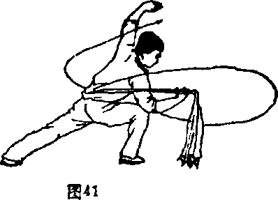 (2)上动不停,右手持刀臂外旋继续向后,向左平摆, 刀背贴靠右上臂和腰后侧,左手上摆并架于头顶左上方,上 体靠近右大腿上方;目视刀柄(图41)。