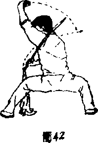 (3)上劭不停,重心左移至两腿之间,屈膝成马步; 右手持刀向右、向前平摆继而臂内旋将刀向左后摆出,刀尖 向斜上方,刀背贴靠左肩后侧;目视左前方(图42)。