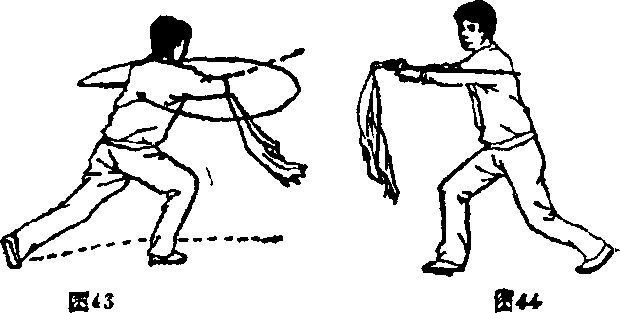 (1)身体稍右转,左脚蹬地,脚跟抬起,两腿屈膝口 右手持刀随转体将刀柄带至体前,左手向下按至右腕内侧, 两手心向下;目视前方(图43及反面图44)。