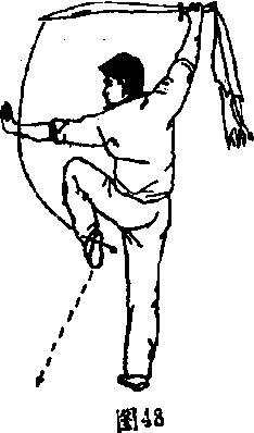 (2)右腿直立支撑,左腿屈膝上提,小腿内收,脚面 绷平;右手持刀向上、向左摆出,刀刃向上,左手向左推 出,掌指向上;目视左前方(图48)0