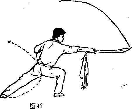 成弓步;右手持刀随转体向前、向右平摆,左手举于体左 侧,两臂伸直,手心向下,上体前俯,目视右前方(留40)。(2)上动不停,右手持刀臂外旋继续向后,向左平摆, 刀背贴靠右上臂和腰后侧,左手上摆并架于头顶左上方,上 体靠近右大腿上方;目视刀柄(图41)。成弓步;右手持刀随转体向前、向右平摆,左手举于体左 侧,两臂伸直,手心向下,上体前俯,目视右前方(留40)。(2)上动不停,右手持刀臂外旋继续向后,向左平摆, 刀背贴靠右上臂和腰后侧,左手上摆并架于头顶左上方,上 体靠近右大腿上方;目视刀柄(图41)。