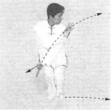 并步下蹲,缩身收臂,速度应由快渐慢。收腿要轻灵敏 捷,含而蓄劲,一合皆合。忽然甩臂上挑,惊弹抖击,要集一 身之劲于左掌。