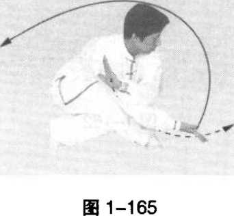 2 .上动不停。随着吸气,右腿轻轻提起向左腿前盖步交 叉,随之两腿屈膝全蹲成歇步;同时,两臂以肩为轴,在胸前 顺时针划弧打舞花,左掌上托变为向右肩内侧截按,掌心朝 右;右掌协调左掌动作,由右上侧顺缠丝向左下方插掌,掌心 朝上,与小腿同高。目视右掌,面向东(图1-165)。