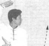 脚随着上挑拳向左前方跨出一步,并屈膝下蹲成右偏马步。目 视左掌,面向东南(图1-163)。
