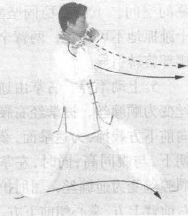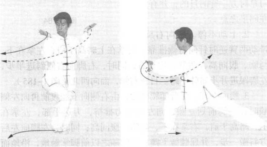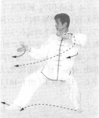 左右推挤,在旋腰转膀中 完成。两膀犹如滚球。两臂要半 圆,腋半虚,始终不失搠劲,使 两臂既有推挤之力,又用斜靠 之势。进步进身,手到劲到。