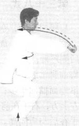 5 .上动不停。腰向右旋,
