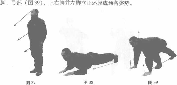 动作要领身体自然前倒同时两臂屈肘置于胸前掌心向下挺膝、收腹、抬头两手主动拍地以手掌及小臂着地(图38)。紧接两手撑地上左