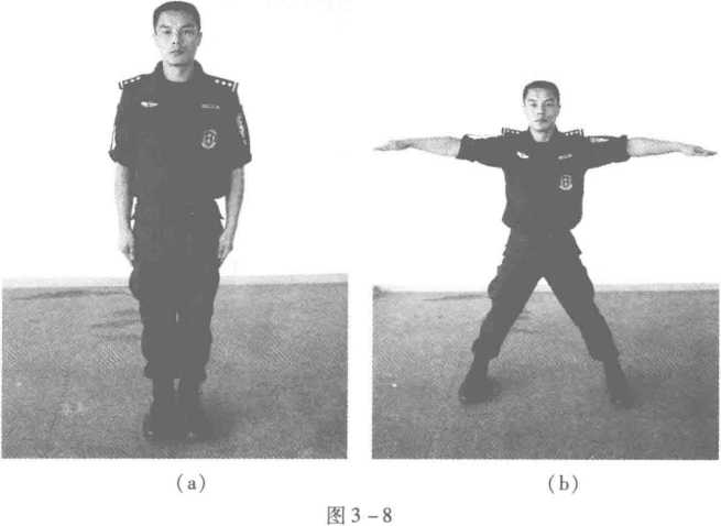 动作要领由并腿跳起分腿落地双手侧平举再由分腿跳起并腿落地双手放下重复以上动作(见图3-8)。