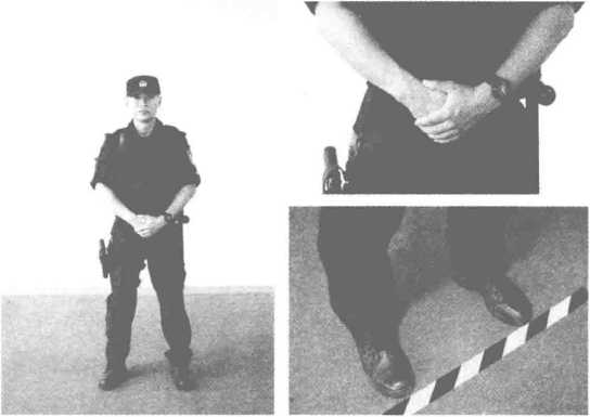 动作要领两脚平行站立与肩同宽右手置于腰带上左手放于右手上目视前方保持警戒状态(见图4-1)。(图4-1)