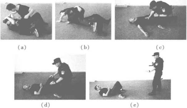 将对方翻转成功后击打其腹部或裆部使其被动防卫随后按压其双膝并快速起身、后撤与其保持安全距离并进行口头警告同时拿取警械、武器对其进行控制(见图4-49、、)。