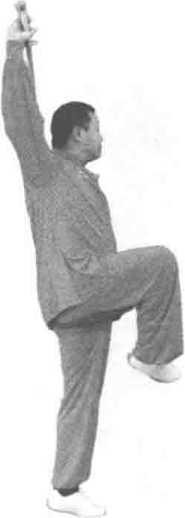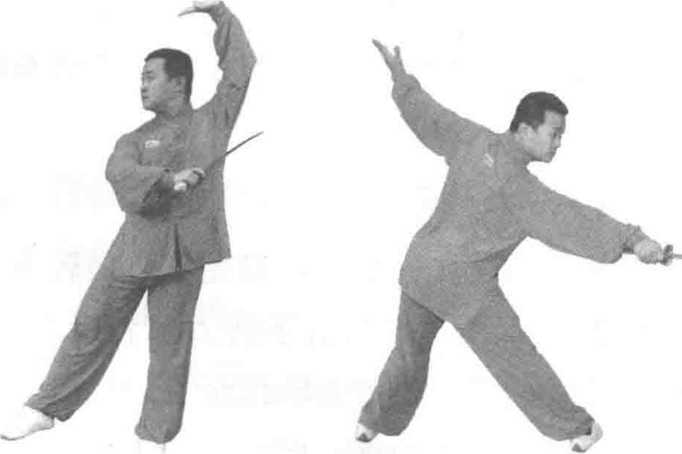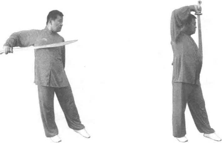 1 .双脚不动身体直立。右手持刀 刀尖向下,向上推举使刀背经左肩贴 背后向下猛扎;右手高于头,刀尖向 下(图5 -1)。