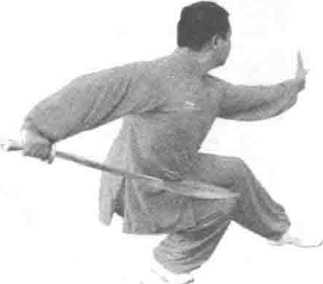 1 .身体右后转180度,同时刀尖顺右腿外下穿,随 着右脚踢腿,由下向上快速上挑扎。目视踢腿方向 (图 5-4、图 5-5)。