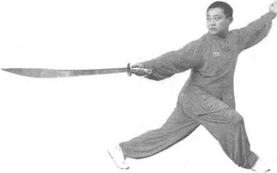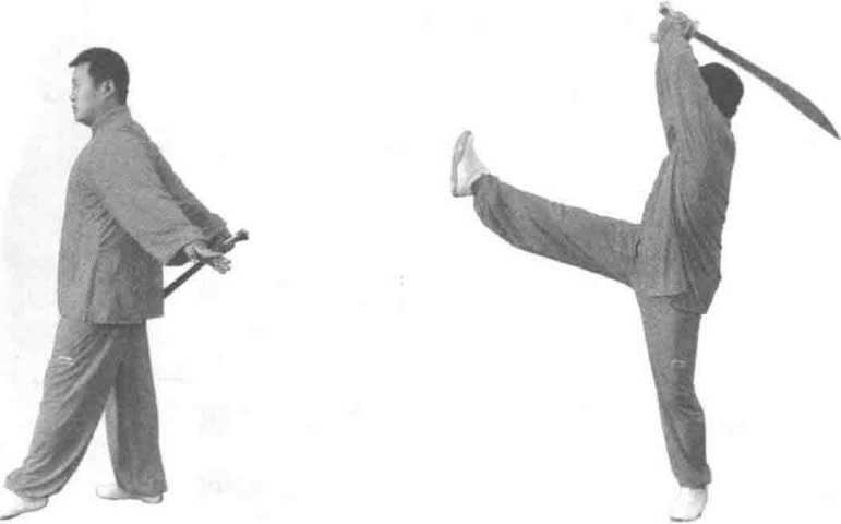 【要点】转身踢腿要协调一致,做到刀随身走,腿 中藏刀。