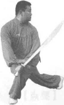 右脚蹬地,左脚跳起前落,右 脚向左脚后插一步成右倒叉步。同 时右手持刀,随跳步使刀刃向上向 左后划弧抡劈;左掌由上向下与右 手相合附于右腕;屈肘抱刀于左腹 前,刀尖斜向上,刀刃向左外。目 视刀尖(图5-7)。