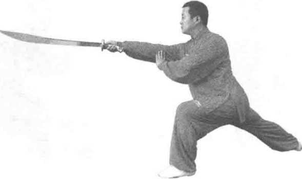 左脚向前上一步成左弓步,同时右手持刀,由后经 腰间向前刺出,刀刃朝下,刀尖朝前;左手掌指随之附 于右肘处。目视刀尖(图6-1)。