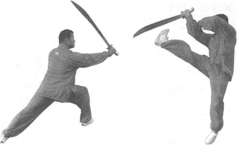 【要点】撩刀时,刀贴于腿外侧,左右跳步连接紧 凑,做到身械协调。
